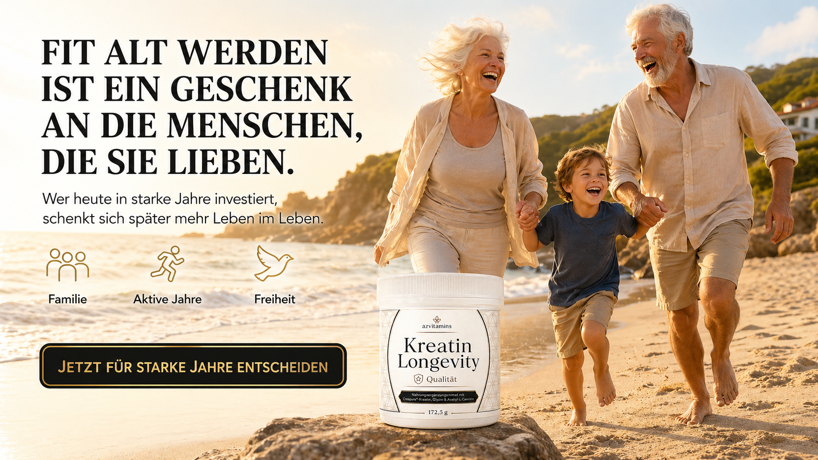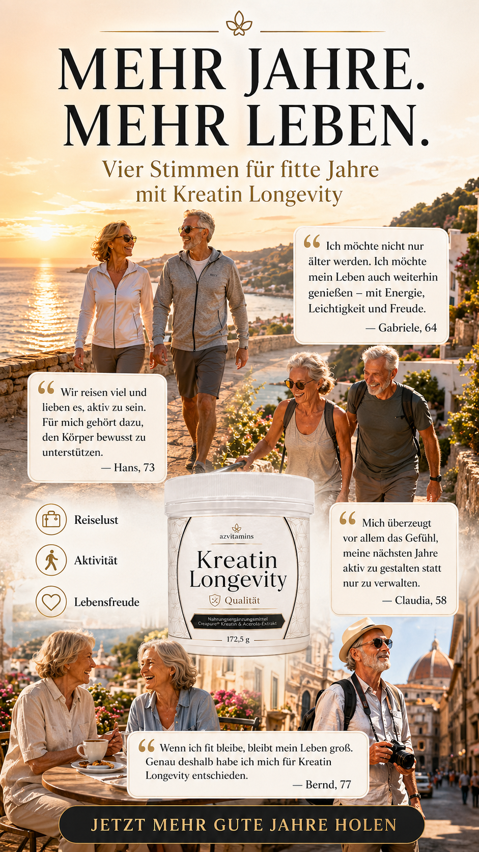 AZ-VITAMINS — KREATIN LONGEVITY ist bewusst einfach gedacht. Eine Tagesportion. Eine klare Formel. Ein fester Platz in Ihrem Alltag.